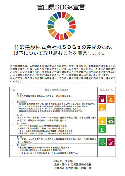 竹沢建設株式会社は、時代のニーズを捉え、常に顧客満足と法令順守の意識を以って、社会に信頼される企業を目指す。
