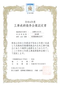 令和4年7月19日、国土交通省北陸地方整備局長様より、令和4年度「工事成績優秀企業」「ICT活用工事成績優秀企業」の認定証をいただきました。