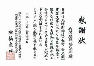 北陸新幹線第二建設局長より感謝状をいただきました