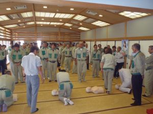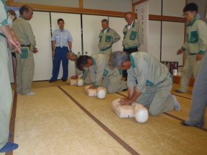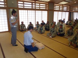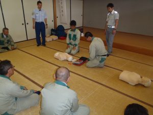 安全大会後、射水市消防本部新湊消防署様講師の下、応急手当講習を行いました。 いざという時大切な命を守るために、心肺蘇生とAEDの使用手順を教えていただきました。