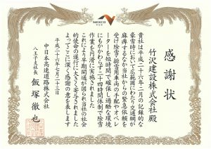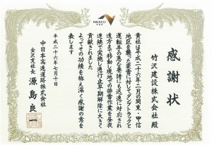 中日本高速道路株式会社金沢支社長より感謝状をいただきました。