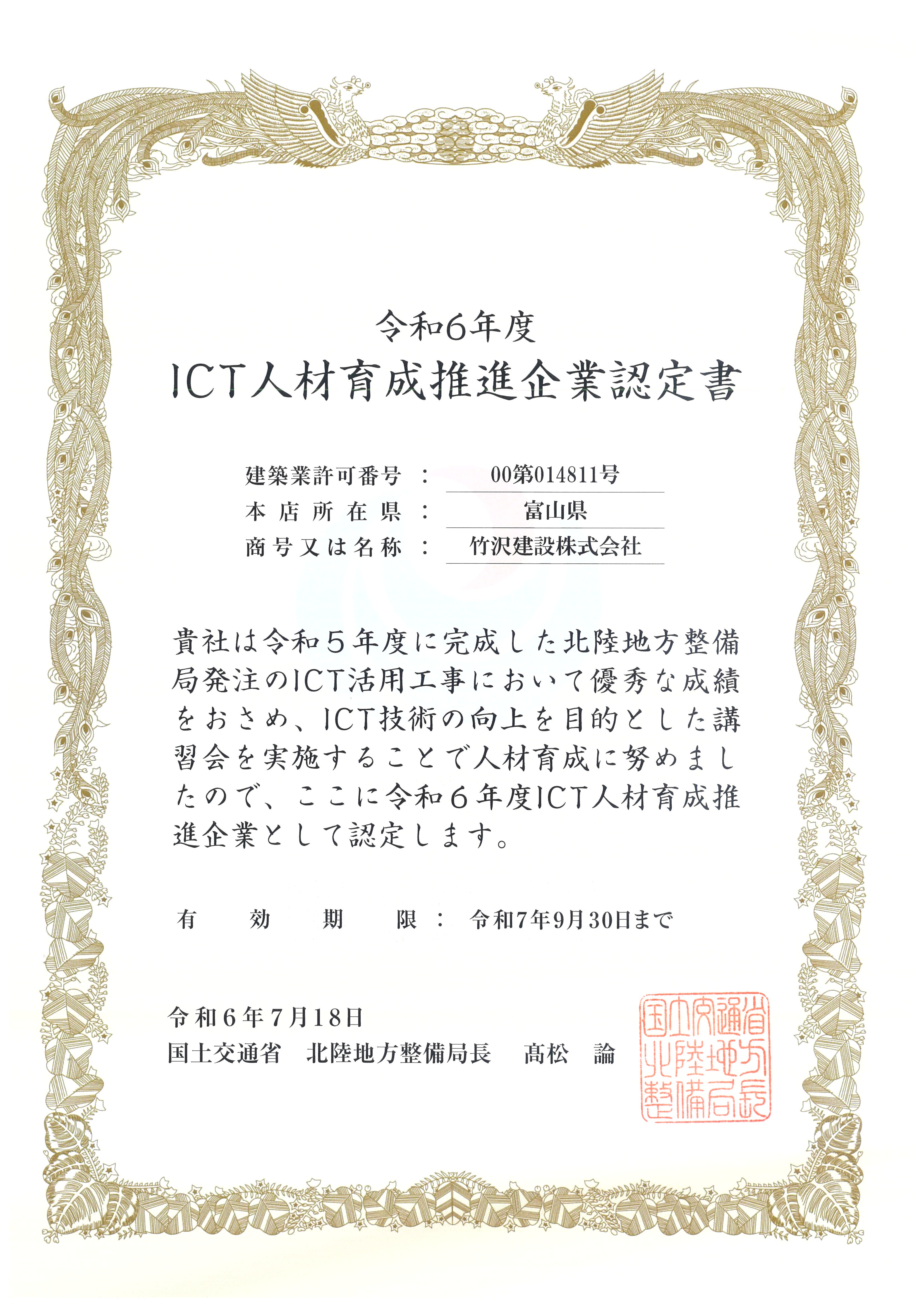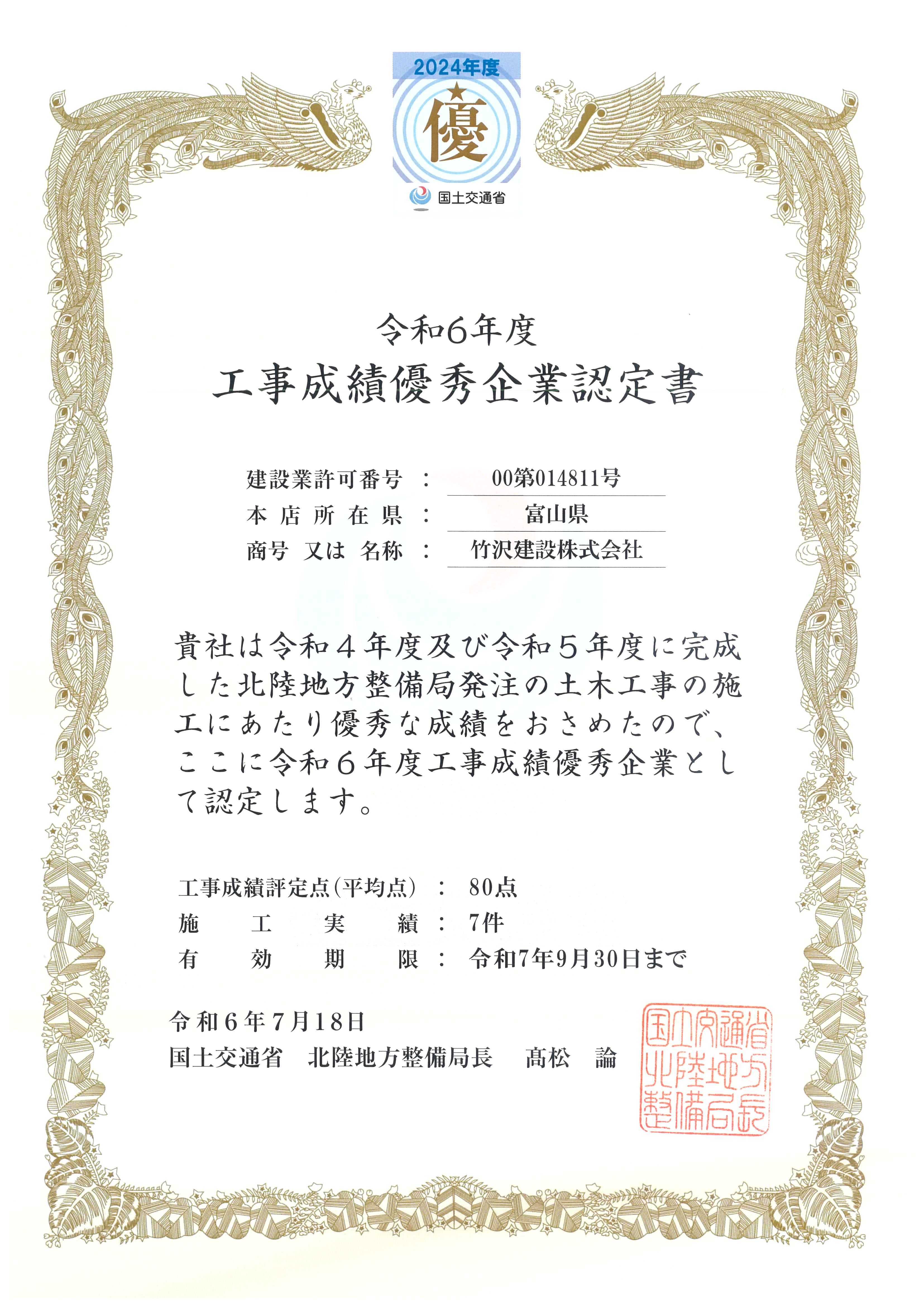 令和6年7月18日、国土交通省北陸地方整備局長様より、令和6年度「工事成績優秀企業」「ICT人材育成推進企業」の認定書をいただきました。