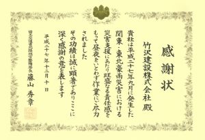 国道交通省北陸地方整備局長より感謝状をいただきました。