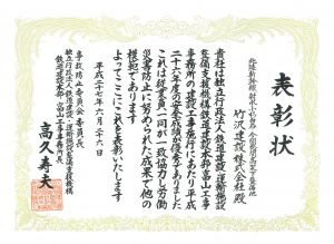 鉄道建設本部富山工事事務所長より表彰状をいただきました